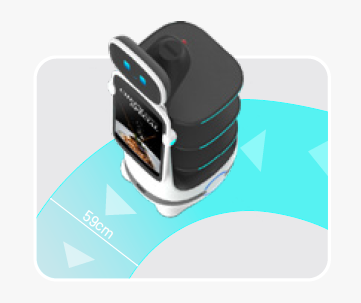 Der Dinerbot T10 hebt sich auch durch seine außergewöhnliche Bewegungsfähigkeit hervor. Mit einer minimalen Wegbreite von nur 58,5 cm meistert er engste Räume, was ihn für verschiedene Umgebungen besonders vielseitig macht. Zudem verfügt er über fortschrittliche VSLAM-Sensoren und eine präzise Navigation durch Sensorfusion mit LiDAR, wodurch ein reibungsloser Betrieb gewährleistet wird.